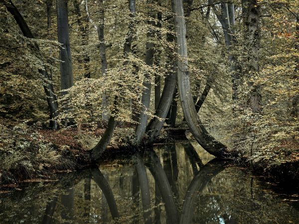 Piękny strumień z niezwykłymi drzewami wiszącymi nad wodą. Połącz tę fototapetę na przykład w salonie.