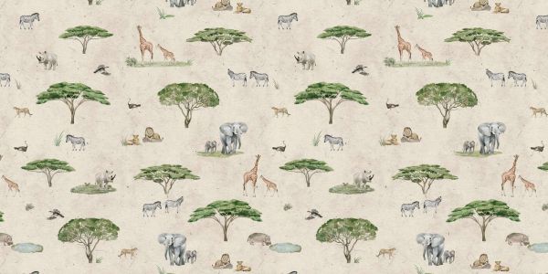 Słoneczny wzór sawanny z dzikimi zwierzętami takimi jak żyrafy, słonie, lwy i zebry, rozproszone między drzewami akacjowymi a otwartymi trawnikami. Tło i szczegółowe ilustracje przywołują ciepło i przestronność afrykańskiej sawanny, idealne dla przygodowego i naturalnego wyglądu w każdej przestrzeni.
