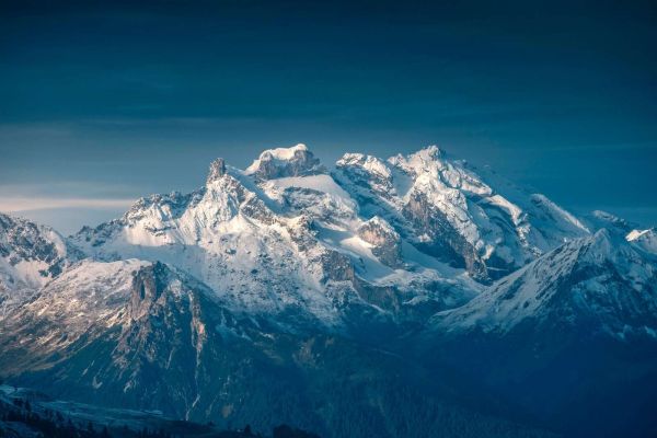 Zlodowaciałe szczyty górują ostro pod głęboko niebieskim niebem. Delikatne światło dzienne podkreśla teksturę skał i warstw śniegu, co tworzy imponującą grę świateł, zimna i wysokości.