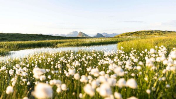 Łagodnie pofałdowany krajobraz pełen kwitnących puszystych kwiatów, z lśniącym pasem wody i szczytami gór na horyzoncie w ciepłym świetle wieczoru.