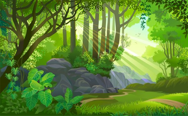 Urocza ilustracja dżungli z promieniami słońca między drzewami.