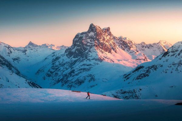 Imponujący krajobraz górski kąpie się w ciepłym świetle zachodzącego słońca. Lodowate pola śnieżne, strome szczyty skalne i delikatne pastelowe kolory tworzą razem spokojną i potężną scenę pełną głębi i spokoju.