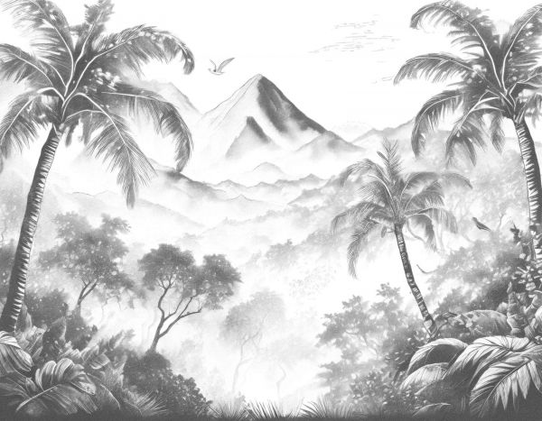 Ten projekt przedstawia spokojną wyspę wulkaniczną, oświetloną miękkim światłem porannego słońca. Palmy kołyszą się delikatnie na wietrze, a odległa góra wznosi się nad mglistym, bujnym lasem.