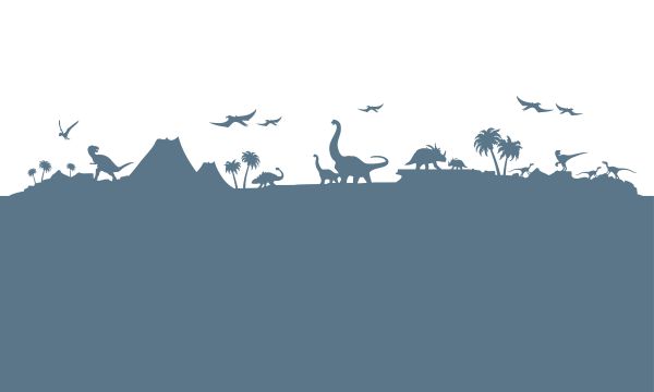 Szaro-niebieskie tło, które przechodzi w połowie nadruku i staje się sylwetkowym krajobrazem z dinozaurami.