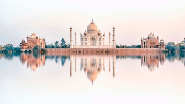 Symetryczna kompozycja słynnego marmurowego budynku, otoczonego przez dwa pawilony z czerwonego kamienia, emanuje niemal duchową równowagę.