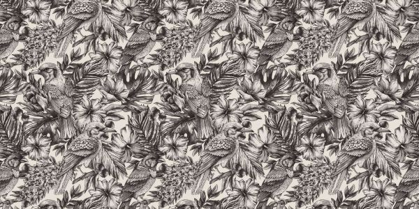 Szczegółowy szkic ptaków gnieżdżących się między bujnymi kwiatami i liśćmi tworzy dynamiczną, ale harmonijną kompozycję. Ta monochromatyczna paleta podkreśla delikatne linie i tekstury, nadając projektowi organiczną i naturalną estetykę.
