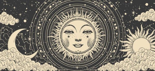 Potężna, szczegółowa scena niebiańska z personifikacją słońca jako centrum — magiczne i mistyczne dzieło sztuki pełne symboliki