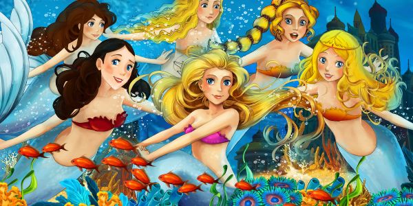 Syrenki w podwodnym świecie z rybami i rafą koralową.