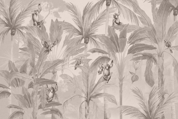 Odkryj elegancką symfonię odcieni szarości, przeplataną sylwetkami tropikalnych palm. Ten projekt oddaje esencję spokojnej oazy, w której zabawne małpy bawią się między liśćmi, sceny, która tchnie zarówno spokój, jak i wibrację.