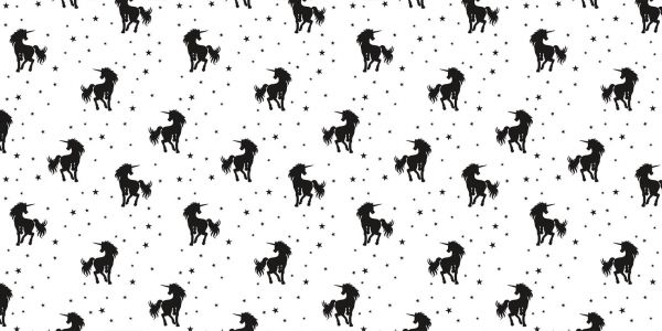 Wzór szczęśliwych jednorożców w kolorze czarnym na białym tle z czarnymi gwiazdami.