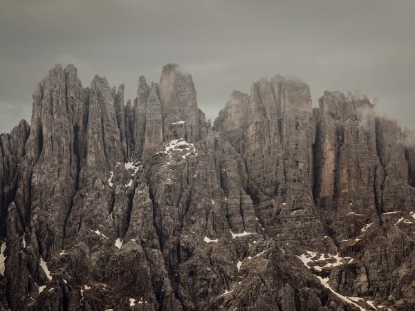Pochmurne szczyty górskie w północnych Włoszech, w Dolomitach. Na górach leży trochę śniegu.