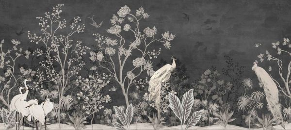 Ta artystyczna reprezentacja białych ptaków i egzotycznej flory na ciemnym tle emanuje spokojem i tajemnicą. Idealne dla nowoczesnego dekoru szukającego dotyku naturalnej elegancji.