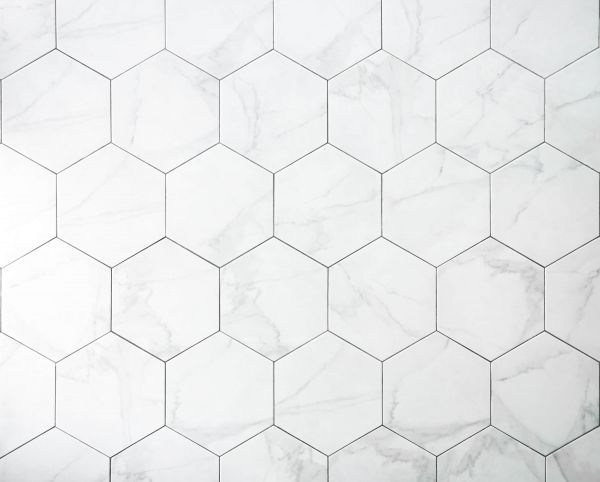 Ściana z białego marmuru z sześciokątnymi płytkami. Połącz to w pokoju, aby uzyskać więcej atmosfery.