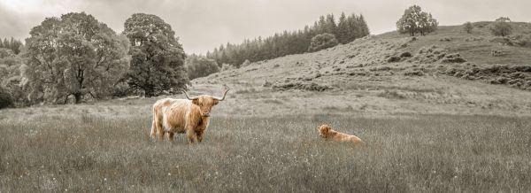 Szkocki wyżyn z cielakiem leżącym w trawie. Góralka chroni swoje cielę.