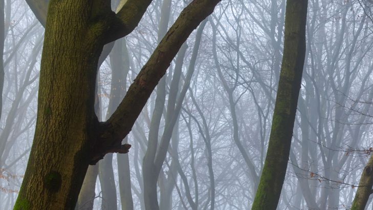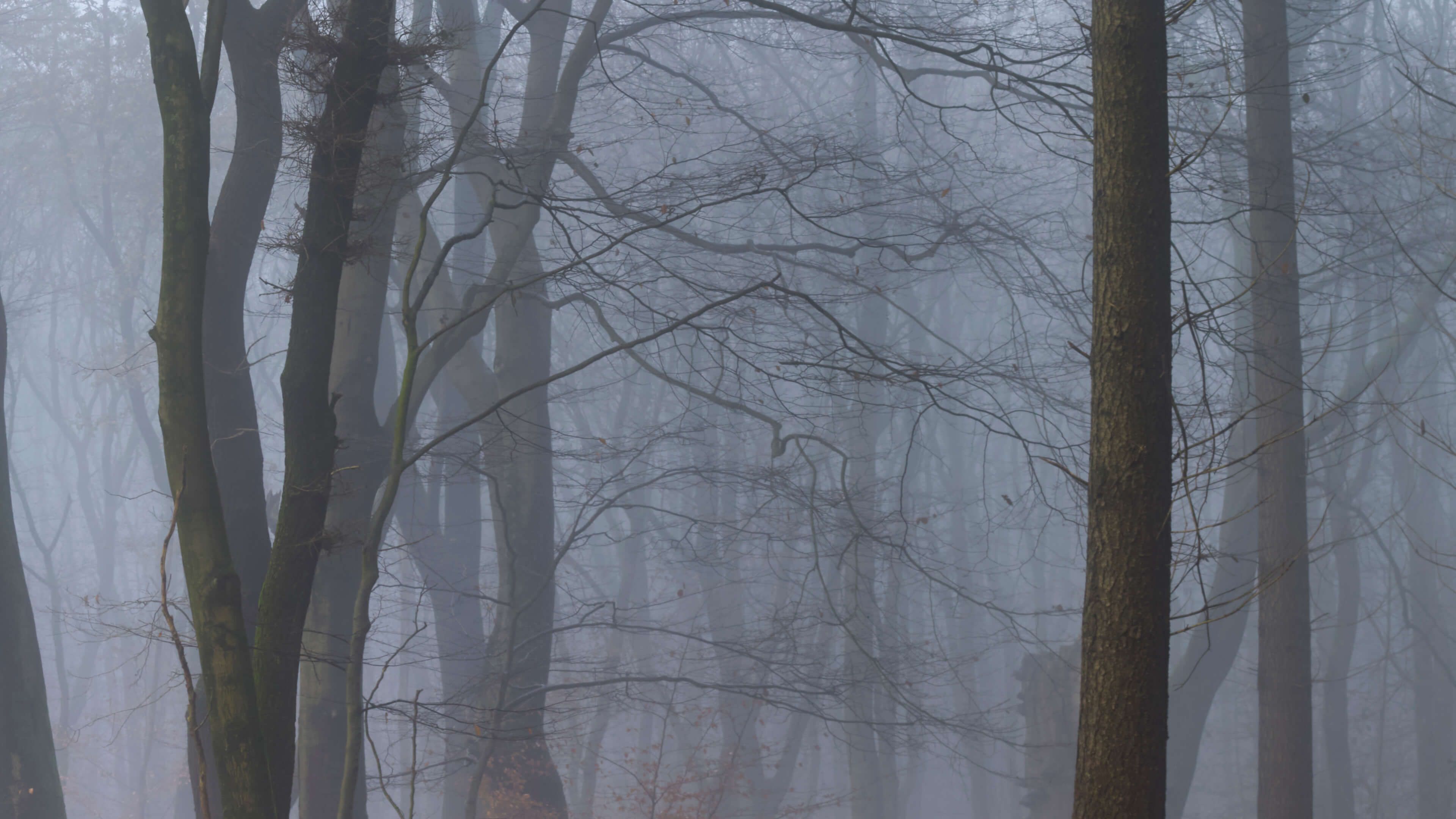 Tajemniczy mglisty las z powalonym drzewem. Las wygląda tajemniczo z powodu mgły.