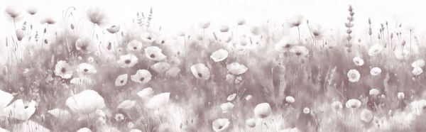 Wesołe, delikatnoróżowe pole kwiatowe, w którym maki, ranunkule i dzikie margaretki swobodnie się ze sobą przeplatają. Pastelowe tło z wyrafinowanymi pociągnięciami pędzla nadaje kompozycji romantyczny, marzycielski charakter.
