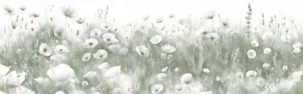 Idyliczna scena z bujnymi polnymi kwiatami w delikatnych odcieniach zieleni i finezyjnych akwarelowych pociągnięciach. Świeże tło emanuje subtelną wiosenną energią, podczas gdy maki i inne dzikie kwiaty przenoszą cię do dopiero co budzącego się poranka w naturze.