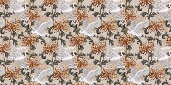 Anielskie łabędzie unoszą się między bujnymi chryzantemami, ich białe pióra kontrastują z ciepłymi kolorami kwiatów. Eleganckie kształty łabędzi i bogate detale chryzantem tworzą żywy i wyrafinowany wzór, który emanuje elegancją i spokojem.