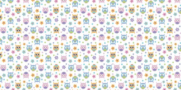 Fototapeta z wzorem słodkich sów, kwiatów i kropek w różnych pastelowych kolorach.