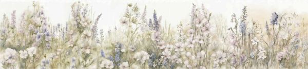 Marzycielska łąka kwiatowa w delikatnych pastelowych odcieniach lawendy, kremu i jasnoróżowego. Drobno malowane kwiaty zdają się tańczyć w lekkim wietrze, z subtelnymi odcieniami, które emanują spokojem i wyrafinowaniem.