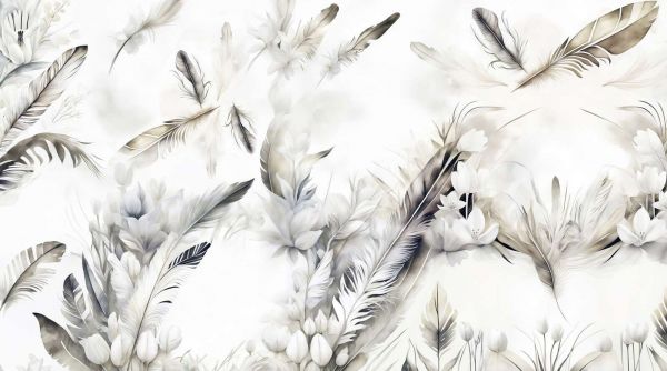 To wyrafinowany projekt wprowadza doskonałą równowagę między naturą a elegancją, z wdzięcznie unoszącymi się piórami i delikatnymi kwiatami w miękkich akwarelowych pociągnięciach. Subtelne odcienie piasku, beżu i kremowych kolorów nadają ciepły i uspokajający wygląd, podczas gdy zwiewna kompozycja wywołuje marzycielski i eteryczny nastrój. Szczegółowe pióra, z ich delikatnymi konturami i subtelnymi przejściami kolorów, dodają zabawowy, ale wyrafinowany element do całości.