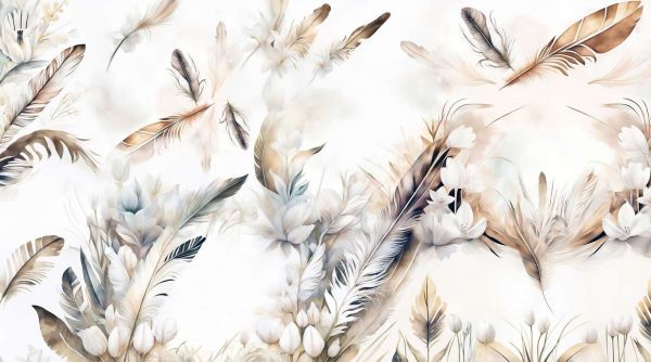 To wyrafinowany i elegancki projekt łączy miękkość piór z delikatnym pięknem białych kwiatów. Pióra zdają się wdzięcznie unosić w powietrzu, podczas gdy kwiaty, dzięki subtelnym akwarelowym pociągnięciom, tworzą naturalną harmonię. Paleta kolorów składa się z ciepłych odcieni beżu, piasku i kremu, uzupełnionych subtelnymi akcentami brązu i delikatnego niebieskiego. Ta kombinacja zapewnia spokojny, lekki wygląd, który doskonale pasuje do różnych stylów wnętrz.