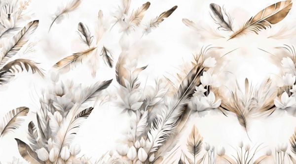 To wyrafinowany projekt wprowadza poczucie lekkości i elegancji dzięki delikatnej równowadze między ozdobnymi piórami a subtelnymi kwiatami. Latające pióra, namalowane w miękkiej akwareli, zdają się poruszać w ciepłym wietrze, podczas gdy białe kwiaty z ich subtelnymi cieniami tworzą harmonijną głębię. Kolory wahają się od ciepłego złota i odcieni piasku po delikatną kremową i subtelne brązy, co zapewnia luksusowy i uspokajający wygląd.