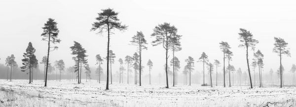 Ośnieżony obszar w przyrodzie z wysokimi drzewami. Połącz tę fototapetę w swojej sypialni lub salonie.