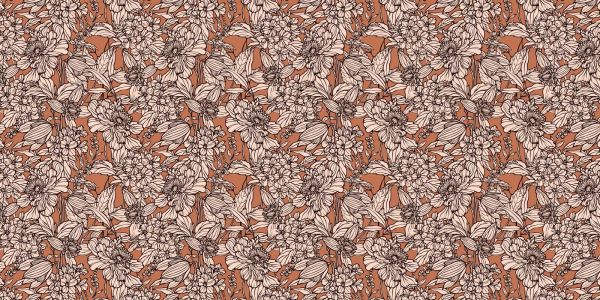 Kolekcja botanicznych rysunków liniowych ożywa na tle terrakota. Ten projekt równoważy siłę monochromatycznych kwiatów z ciepłem podłoża, tworząc rustykalną, ale jednak nowoczesną atmosferę.