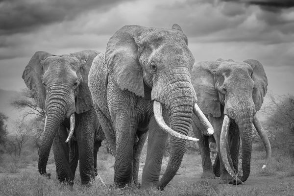 Czarno-biały obrazek przedstawiający trzy słonie. Ponieważ obraz jest w czerni i bieli, można łatwo połączyć tę fototapetę w prawie każdym domu.