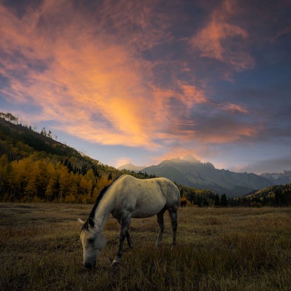 Koń pasący się między górami o zachodzie słońca.