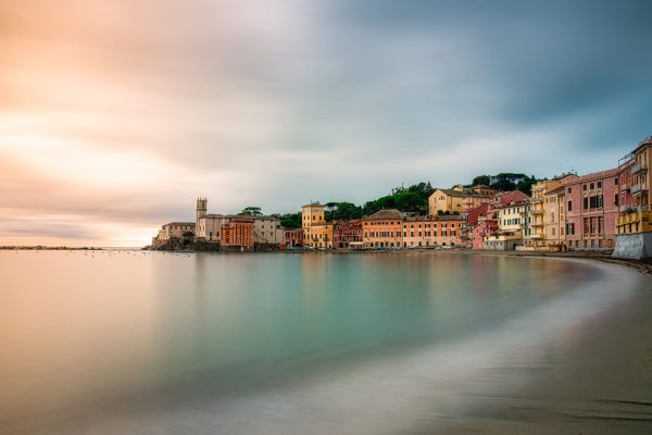'Silence bay'', przedstawia opuszczoną plażę podczas pochmurnego dnia. Kolorowe domy sprawiają, że ta fototapeta jest klimatyczna.