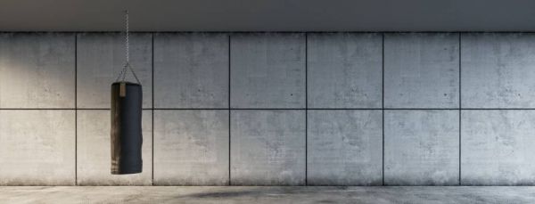 Worek treningowy z betonowym tłem w centrum fitness. Mocny i industrialny wizerunek dla mocnego i sportowego wyglądu.