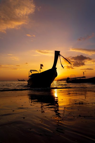 Tradycyjna łódź longtail na plaży w Tajlandii o zachodzie słońca