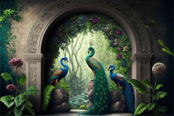 Trzy piękne pawie prezentują swoje kolorowe pióra w mistycznym ogrodzie, otoczone przez bogatą roślinność i kwiaty, wszystko oprawione w elegancką kamienną bramę.