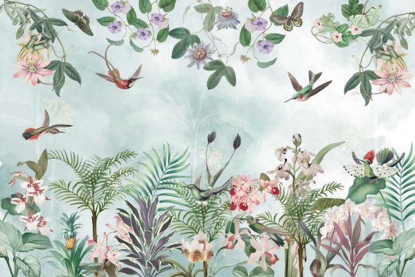 Este diseño captura la esencia de un paraíso tropical, donde la belleza natural y la serenidad se unen. Flores exóticas como orquídeas y maracuyá florecen entre exuberantes palmeras y diversas hojas verdes. Los colibríes flotan graciosamente por el aire, rodeados de sutiles mariposas que bailan delicadamente entre las flores. La combinación de colores, compuesta por suaves tonos pastel y toques alegres, realza un ambiente fresco y relajado.