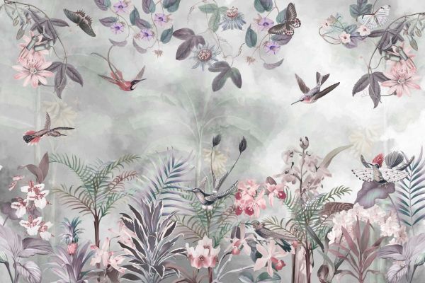 Este diseño captura la esencia de un paraíso tropical, donde la belleza natural y la serenidad se unen. Flores exóticas como orquídeas y maracuyá florecen entre exuberantes palmeras y diversas hojas verdes. Los colibríes flotan graciosamente por el aire, rodeados de sutiles mariposas que bailan delicadamente entre las flores. La combinación de colores, compuesta por suaves tonos pastel y toques alegres, realza un ambiente fresco y relajado.