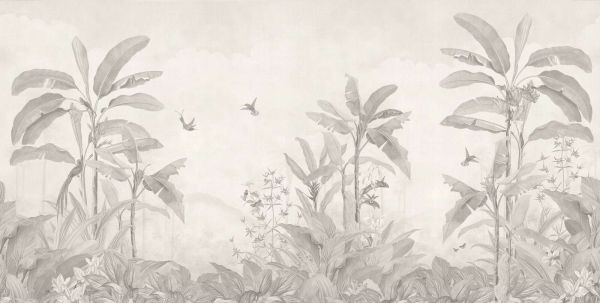 Ta elegancka ilustracja ożywia spokojną tropikalną atmosferę delikatnymi odcieniami szarości. Duże rośliny bananowca dominują kompozycję swoimi imponującymi liśćmi i subtelnymi detalami tekstury. Poniżej rozwija się bogata warstwa roślinności z kwiatami i roślinami tropikalnymi, podczas gdy wdzięczne kolibry i motyle dodają lekkości i ruchu do spokojnej sceny. Dzięki stonowanej czarno-białej stylistyce ten projekt doskonale komponuje się zarówno z nowoczesnymi, jak i klasycznymi stylami wnętrzarskimi. W nowoczesnym wnętrzu można go połączyć z jasnymi gatunkami drewna, minimalistycznymi meblami i naturalnymi tkaninami, takimi jak len czy bawełna. W klasycznym wnętrzu dodaje on szczyptę wyrafinowania, zwłaszcza w połączeniu z ciemnymi meblami drewnianymi, antycznymi akcentami i miękkimi aksamitami. Paleta kolorów składa się z różnych odcieni szarości, co zapewnia ponadczasową i neutralną bazę. Delikatne linie i realistyczne botaniczne detale nadają mu artystyczny wygląd, który pasuje zarówno do miejskich loftów, jak i wiejskich domów. Połączenie flory i fauny przynosi spokój, podczas gdy brak koloru zapewnia elegancję i wszechstronność. Ten projekt szczególnie dobrze prezentuje się w sypialni, biurze domowym lub oranżerii, gdzie zapewnia spokój i inspirację. Również w hotelowej recepcji lub strefie wellness tworzy naturalną, luksusową atmosferę, nie dominując wizualnie.
