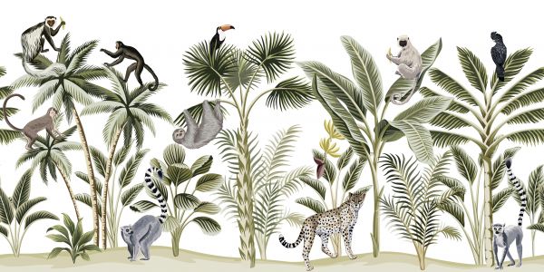 Tropikalna tapeta z różnymi roślinami i zwierzętami.