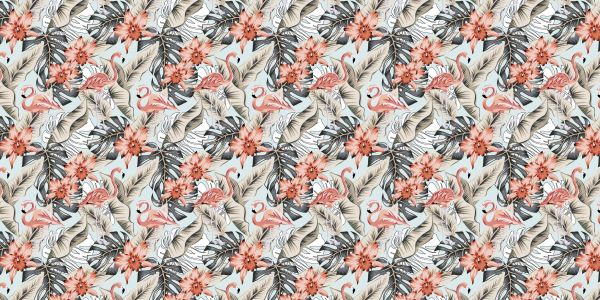 Tropikalny różowy flaming z kwiatami orchidei, liśćmi bananowca i palmami na jasnoniebieskim tłem.