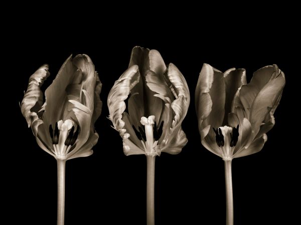 Trzy tulipany na czarnym tle. Uzyskaj więcej atmosfery w pomieszczeniu w wyjątkowy sposób.