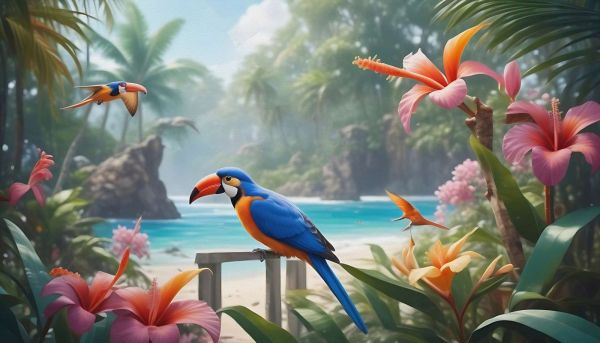 Żywy tukan stoi na pierwszym planie w tym tropikalnym raju, otoczony bujnymi kwiatami i zapraszającym błękitnym oceanem. Jasne kolory ptaka i otaczającej flory promieniują ciepłym, egzotycznym urokiem, który uchwyci istotę oazy na wyspie.