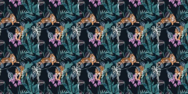 Tropikalny wzór z tygrysów, liści i kwiatów na czarnym tle.