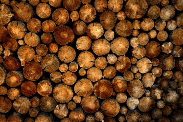 Ułożone w stosy ścięte drzewa w różnych materiałach