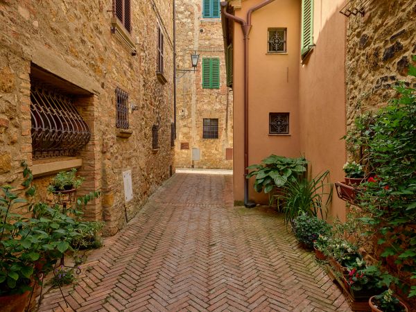 Piękna włoska ulica z roślinami i kwiatami w słoneczny dzień. Połącz tę fototapetę w swoim domu, aby uzyskać jeszcze więcej atmosfery.
