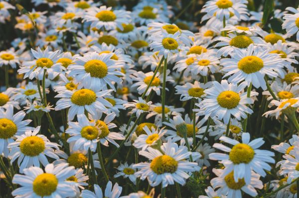 Piękny obraz z bliska białych stokrotek i zielonych gałązek w stylu vintage.