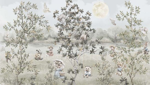 Ta wzruszająca ilustracja przedstawia idylliczną scenę pełną uroczych leśnych zwierząt, które wspólnie spędzają letni dzień nad brzegiem spokojnego jeziora. Scena jest bogata w detale i pełna życia: jeż huśta się na gałęzi, borsuk gra na mandolinie, żaba łapie motyle siatką, a króliki dbają o swój ogród lub czytają na trawie. Każde zwierzę jest ubrane w nostalgiczne, wiejskie ubrania, co przyczynia się do vintage'owego i rustykalnego klimatu. Kolorystyka składa się z delikatnych odcieni zieleni, ciepłego beżu, przygaszonego niebieskiego i jasnobrązowego. Te naturalne i subtelne kolory nadają spokojny, przyjazny wygląd, który doskonale pasuje do skandynawskich lub wiejskich wnętrz. Pomyśl o drewnianych meblach, jasnych lnianych tkaninach i rattanowych akcesoriach, aby jeszcze bardziej podkreślić tę atmosferę. Dzięki bogatym detalom i baśniowemu charakterowi ta ilustracja jest idealna do pokoi dziecięcych, pokoi zabaw lub nawet kącików do czytania. W połączeniu z półkami na książki z naturalnego drewna, plecionymi koszami na przechowywanie i przytulnymi poduszkami, przestrzeń staje się zapraszającym miejscem, w którym dzieci mogą zatracić się w opowieściach i zabawie. Drzewa, ptaki, kwiaty i szemrząca rzeka w tle wprowadzają poczucie spokoju i więzi z naturą. Scena emanuje nostalgiczny i niemal ponadczasowy klimat – jakbyś przeglądał książkę dla dzieci. Jednocześnie postacie i ich aktywności pobudzają wyobraźnię i zachęcają do kreatywnej zabawy.