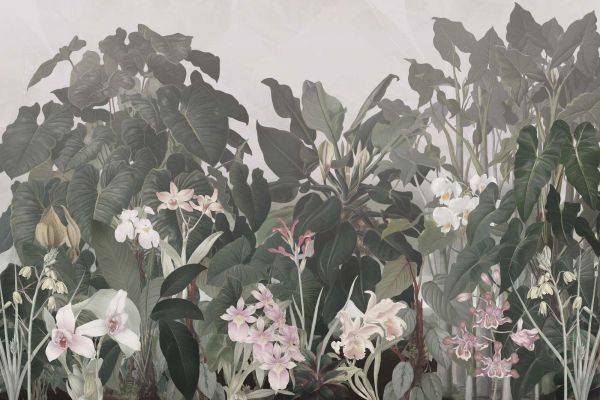 Un diseño lujoso con exuberantes hojas tropicales y delicadas flores. Estos patrones aportan una atmósfera exótica y una experiencia refinada de la naturaleza a cualquier habitación.