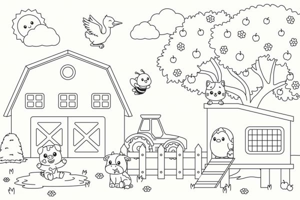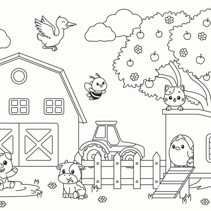 To projekt ożywia wesoły krajobraz wiejski w zabawowym i przyjaznym dzieciom stylu. Różne urocze zwierzęta – w tym radosna świnka błotna, ciekawski pies, przytulny kot na górze budy i zadowolona kura w kurniku – razem z uśmiechniętym słońcem, pszczołą, bocianem i jabłonią tworzą żywą całość. Obecność traktora, ogrodzenia i urokliwej stodoły dopełnia scenę.