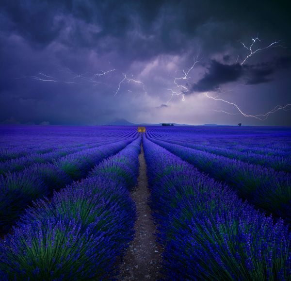 Wetter im Lavendelfield na fototapecie Burza z piorunami nad polami lawendy dla spektakularnego obrazu.
